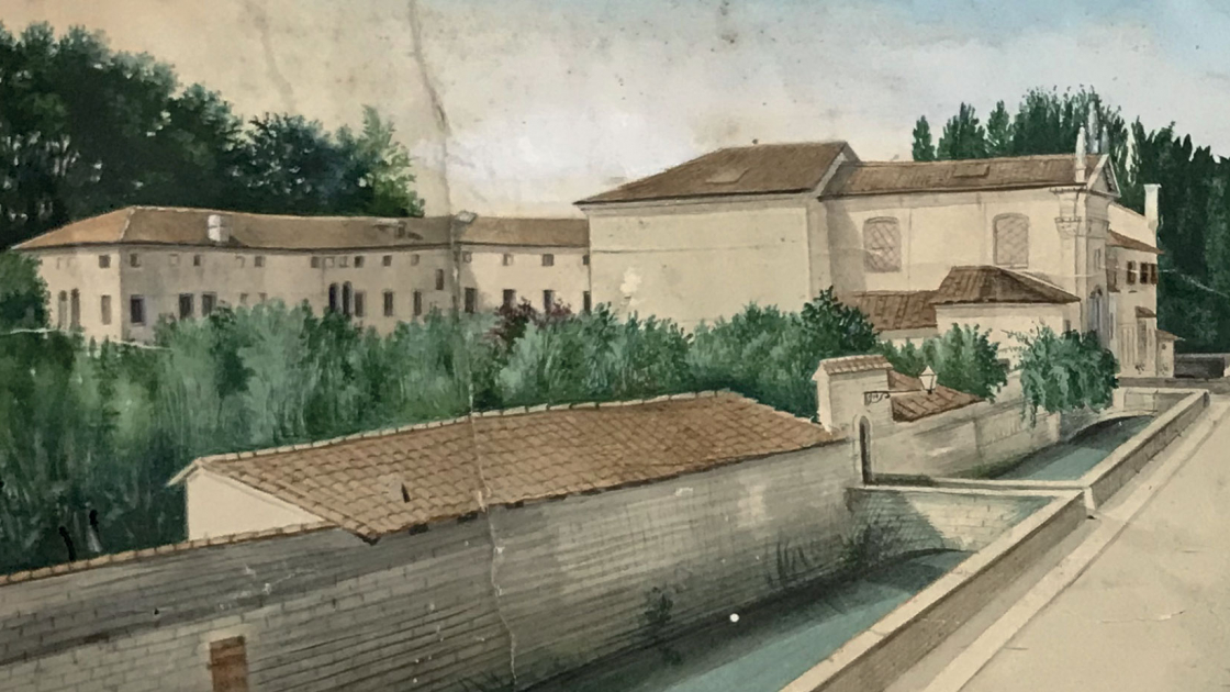 Veduta del complesso architettonico e della chiesa edificata a metà Settecenti della Casa secolare delle Dimesse a Padova,1874 (Archivio storico delle Dimesse)