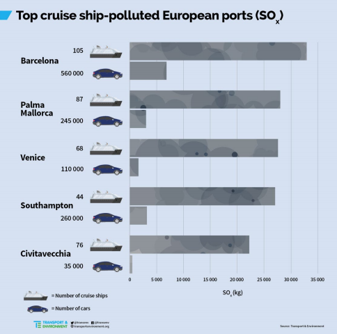 Il report si riferisce al 2017 ed analizza come le 203 navi da crociera in Europa abbiano emesso circa 62 kt di ossidi di zolfo, 155 kt di ossidi di azoto, 10 kt di particolato (PM) e 10,286 kt di CO2. Gran parte di queste emissioni è concentrata nel mar Mediterraneo e nei porti principali, cioè Spagna, Italia, seguite da Grecia e Francia.