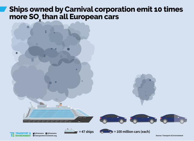 Il report poi mette in luce come solamente le 47 navi da crociera della compagnia Carnival Corporation emettano circa 10 volte più ossidi di ossidi di zolfo (SOx) rispetto il totale delle auto presenti in Europa, cioè circa 260 milioni di veicoli.
