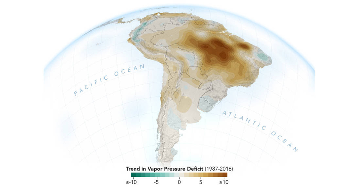 The image shows the decline of moisture in the air over the Amazon rainforest, particularly across the south and southeastern Amazon. Foto:NASA/JPL-Caltech, NASA Earth Observatory