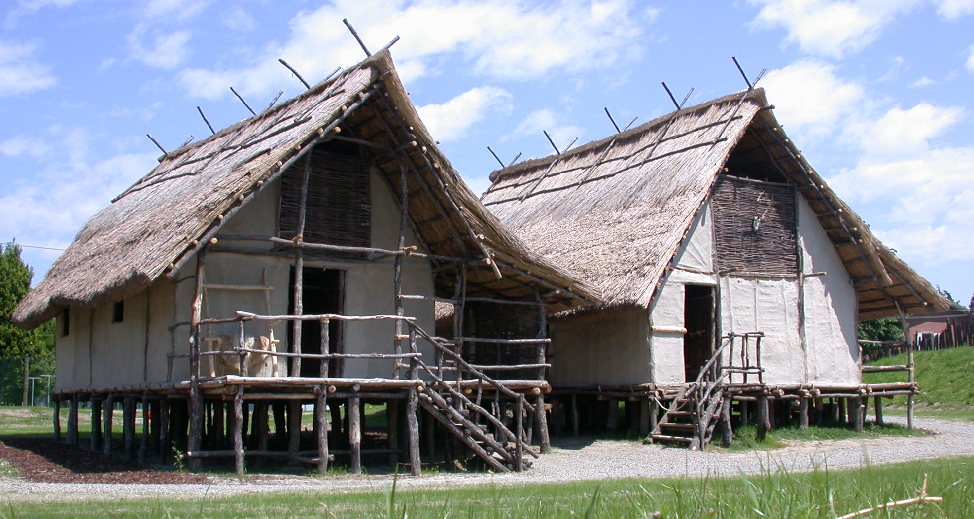 Ricostruzione di due abitazioni nel museo all'aperto del Parco della Terramara di Montale. Foro: Paolo Terzi - Archivio fotografico Museo Civico Modena, CC BY 3.0, https://commons.wikimedia.org/w/index.php?curid=72370414