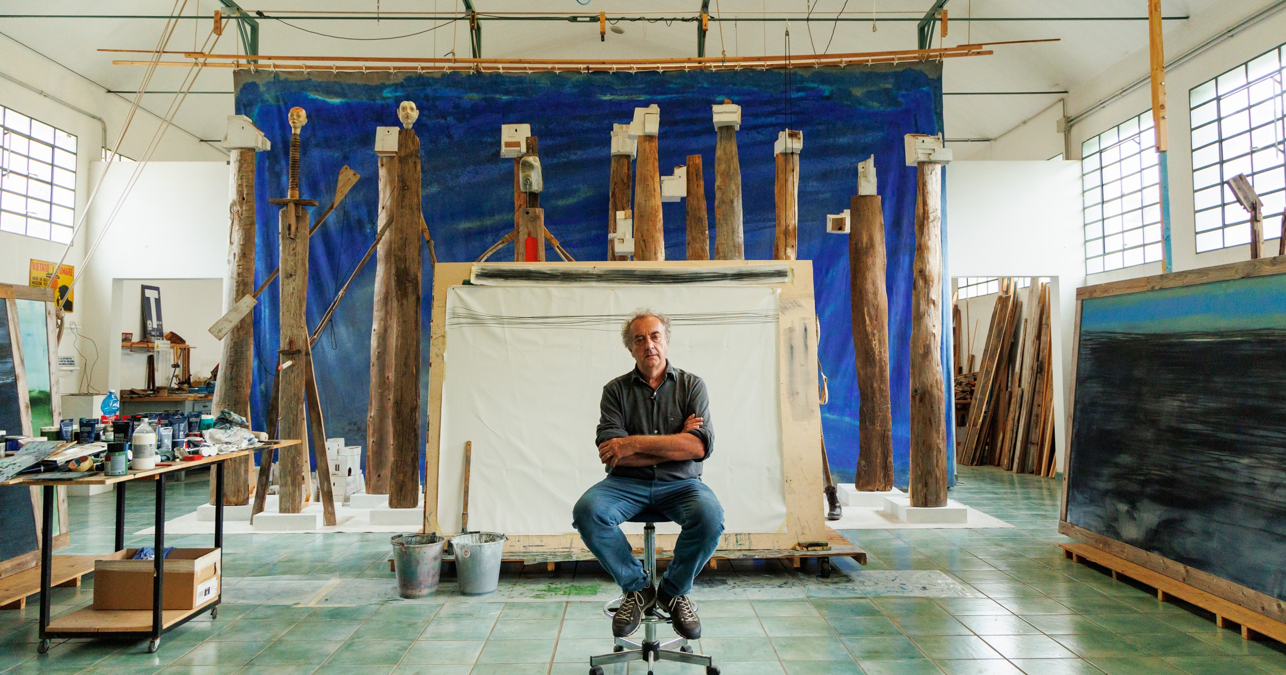 "Ho sempre sentito un forte desiderio di esprimermi, non per narcisismo ma per il bisogno di raccontare. Da bambino mi rifugiavo in cantina e lì restavo tutto il giorno: oggi questo spazio, che mi sono costruito, ha lo stesso sapore, è un rifugio. Nei momenti importanti della vita sto qui, perché questo è il luogo in cui la mia mente si apre". Scenografo, pittore, scultore con un passato nella scuola del circo francese di Annie Fratellini, Antonio Panzuto, protagonista del trentesimo episodio della serie dedicata agli atelier, è un artista con infiniti talenti, una personalità magnetica e avvolgente e una rara capacità di suscitare stupore, raccontando e condividendo la sua idea di arte. Ci accoglie con gioia nel suo atelier a Padova, una ex fabbrica organizzata su due piani con un primo livello più ampio, per lavorare su opere grandi e organizzare spettacoli per pochi fortunati, e il secondo più intimo, dove disegnare, progettare al computer o intervenire su un teatrino di posa che anticipa la meraviglia delle sue scenografie reali.