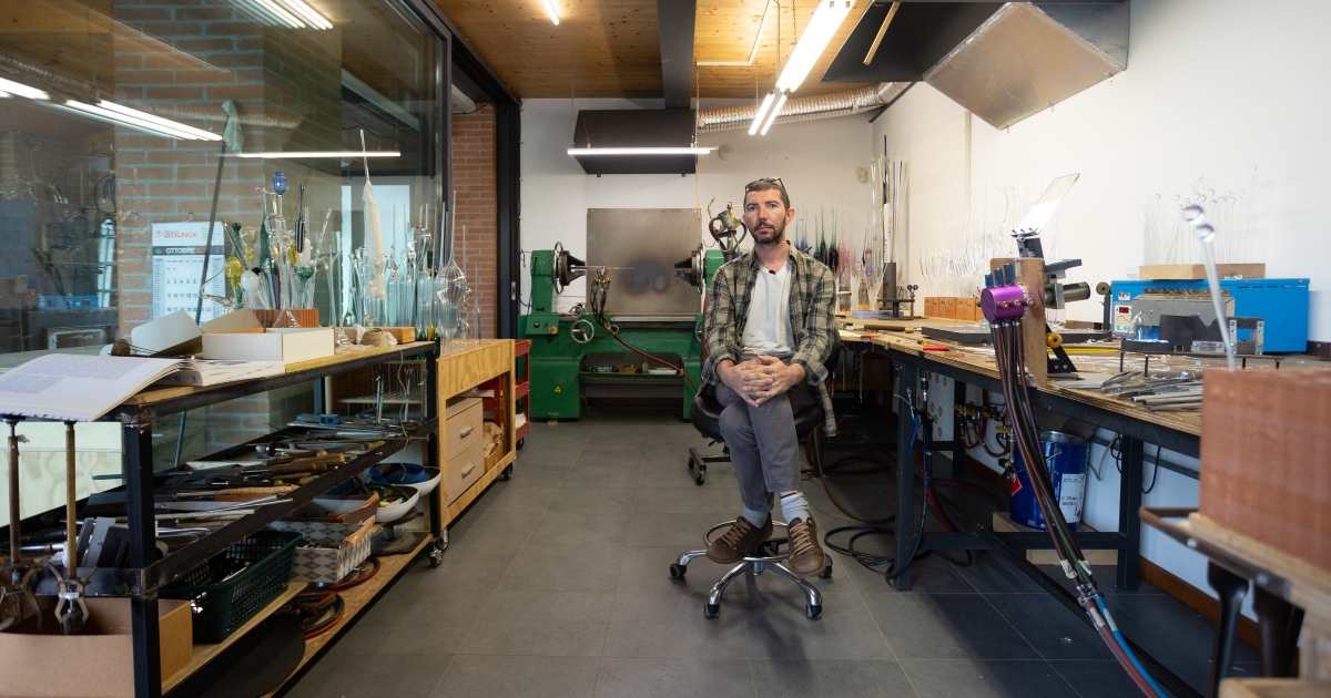 Lunghi tavoli, forni, il tornio da vetro, strumenti per ogni esigenza: lo spazio, al piano terra della casa dell'artista, ha tutto ciò che serve e al tempo stesso mantiene una "dimensione ideale per riuscire a lavorare in maniera intima: è importante per me avere un ambiente dove potermi esprimere senza distrazioni". Crestani si occupa di vetro soffiato artistico contemporaneo. "Vivo e lavoro in campagna. Il laboratorio è piccolino ma sufficiente per permettermi di mantenere una produzione totalmente indipendente, cosa per me fondamentale". Lavora con il vetro borosilicato, quello che viene anche chiamato Pyrex, "un vetro nato nel Novecento per le esigenze dell'industria chimica e che non può essere lavorato in fornace perché fonde a temperature troppo alte e raffredda troppo velocemente. Per la lavorazione viene usata la fiamma ossidrica: nel mio studio ce ne sono diverse, ogni tipo di fiamma ha una sua funzione specifica". E continua: "Il vetro è un materiale complesso e le fasi di produzione possono essere molto lunghe e complicate, a queste si aggiunge quasi sempre una fase rischiosa. Fa parte del gioco. C'è sempre un momento, all'inizio o alla fine, in cui un minimo errore può portare alla rottura del pezzo".