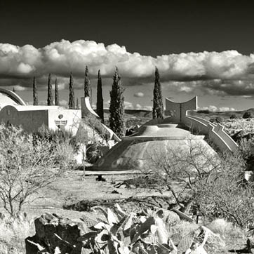 Da quarant’anni, ogni giorno, Paolo Soleri faceva lezione agli studenti, arrivando a mettere nelle loro mani anche gli strumenti del muratore. Era stato a sua volta allievo del grande maestro americano dell’architettura organica Frank Lloyd Wright, con il quale aveva lavorato alla costruzione di Taliesin West subito dopo la laurea al Politecnico di Torino. Con Wright entrò in grave disaccordo a causa delle teorie del maestro sulla Broadacre City, apoteosi della suburbia orizzontale percorsa dall’automobile. Nonostante la rottura, nell’opera di Soleri è evidente la lezione di Wright sull’anelito alla realizzazione e all’idealizzazione in senso propositivo; ed è inoltre proprio dall’esperienza a Taliesin che l’architetto italiano partì alla ricerca di una propria visione. La trovò prima a Cosanti, primo esperimento della sua furia creativa e poi sede della Fondazione Cosanti (un gioco di parole italiane, cosa + anti, in senso antitetico) nei pressi di Scottsdale, Arizona, dove si stabilì con la moglie Colly nel 1956. Poiché però quel luogo era troppo ridotto per contenere il complesso piano urbano che aveva intenzione di realizzare, fra la fine degli anni Sessanta e i primi anni Settanta acquistò un terreno più vasto dove sarebbe cresciuta Arcosanti.