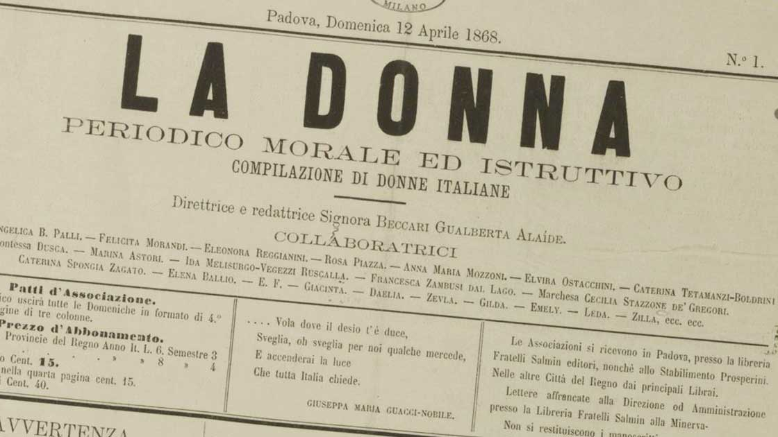 Compiono 150 anni queste parole che, a firma della giovanissima Gualberta Alaide Beccari, aprivano il Programma del primo numero de la rivista La donna, il primo periodico redatto da sole donne fondato nel 1868 a Padova sotto la direzione dell’allora ventiseienne Beccari.