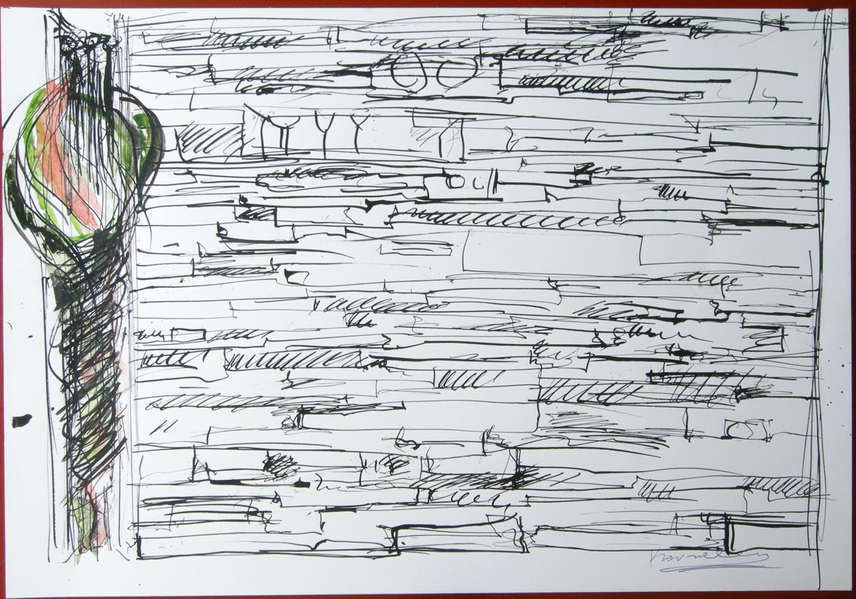 Anche se il foglio n. 5 dà ancora risalto al viluppo di bandiere e corda, tanto più che è colorato, per il resto esso attesta finalmente la crescita ad altezza intera della parete di legno e la sua assimilazione a una barricata sgangherata. Rimangono alcune differenze rispetto all’opera finita: l’affastellamento non si spiana nella parte superiore e certi circoletti tra le travi forse ancora immaginano degli inserti oggettuali.