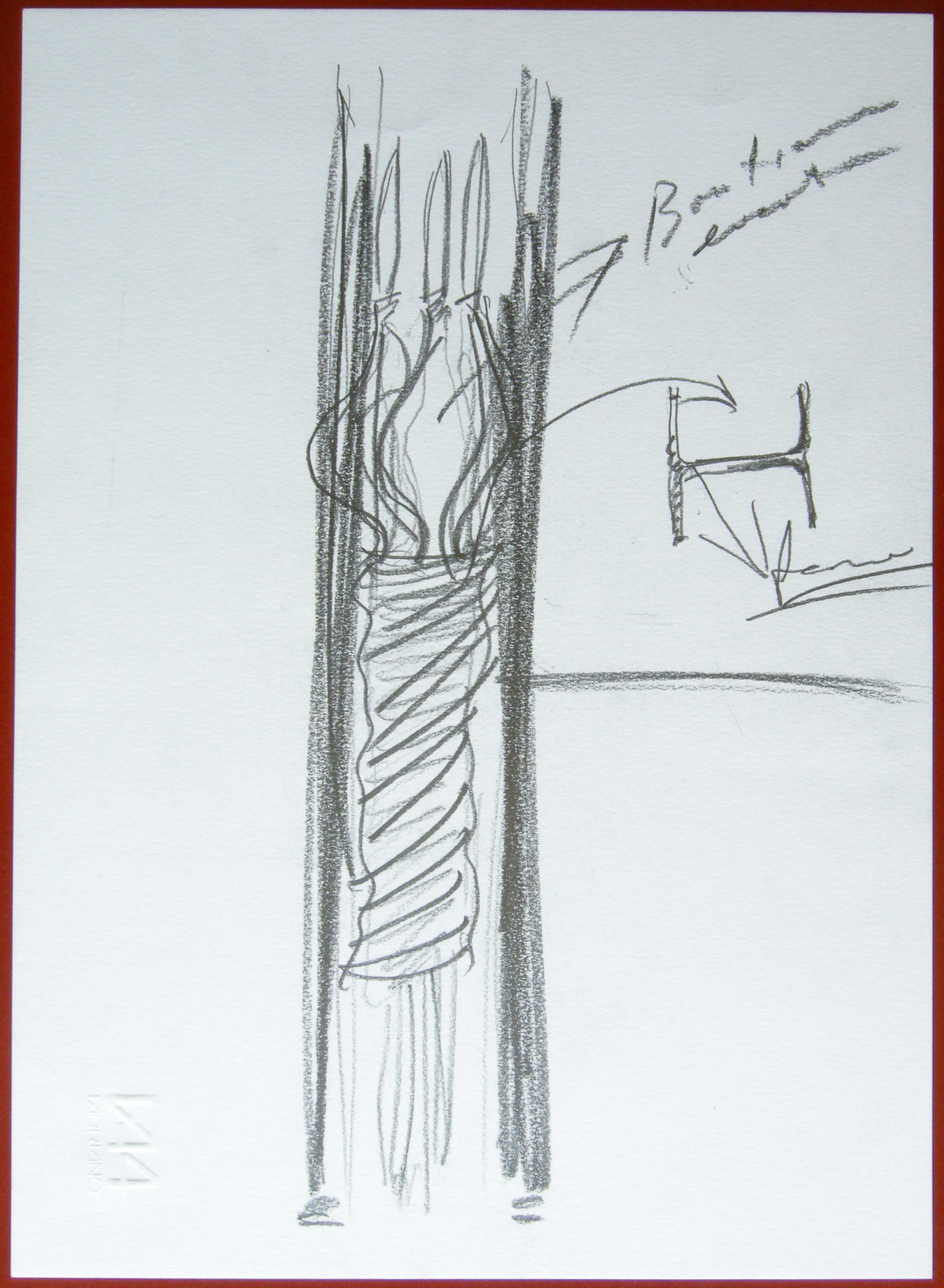Sempre nel primo disegno, le altre scritte citano a uno a uno i materiali dell’opera, rivelando l’attitudine, tipica dell’artista, a rendere significativa la materia in sé. Si noti che i materiali sono quattro, numero che evoca le antiche ripartizioni degli elementi: in questo caso il «ferro», che è l’elemento possente e affidabile della trave (più precisamente acciaio nell’opera finita); le «3 bandiere», che sono colori e simbolo di un ideale; il terzo elemento è la «corda» di cui parla la descrizione del progetto ma poi espunta dalla realizzazione. Al proposito, prima di dire del quarto elemento, va notato che tutti e cinque gli studi, pur attestando ripensamenti notevoli, sono accomunati dall’idea della corda che si avvinghia alle bandiere in modo drammatico, avvolgendole in una spirale che richiama un nodo scorsoio. La corda è molto utilizzata da Kounellis tra gli anni Ottanta e Novanta, spesso per legare all’insieme componenti rigide, quali pietre o parti metalliche, esaltando così la forza celata nella natura morbida e organica del materiale. In questo caso la corda ha un significato ambiguo: è un qualcosa che si aggrappa con foga all’ideale e allo stesso tempo lo soffoca. Nell’opera finita le tre bandiere, con le loro aste di acciaio, sono semplicemente appoggiate alla putrella, una soluzione meno esuberante dal punto di vista espressivo ma efficace nel darsi come “grafia”: una sorta di freccia colorata, a imprimere il movimento ascendente che nel primo bozzetto è dato dai dislivelli della struttura.