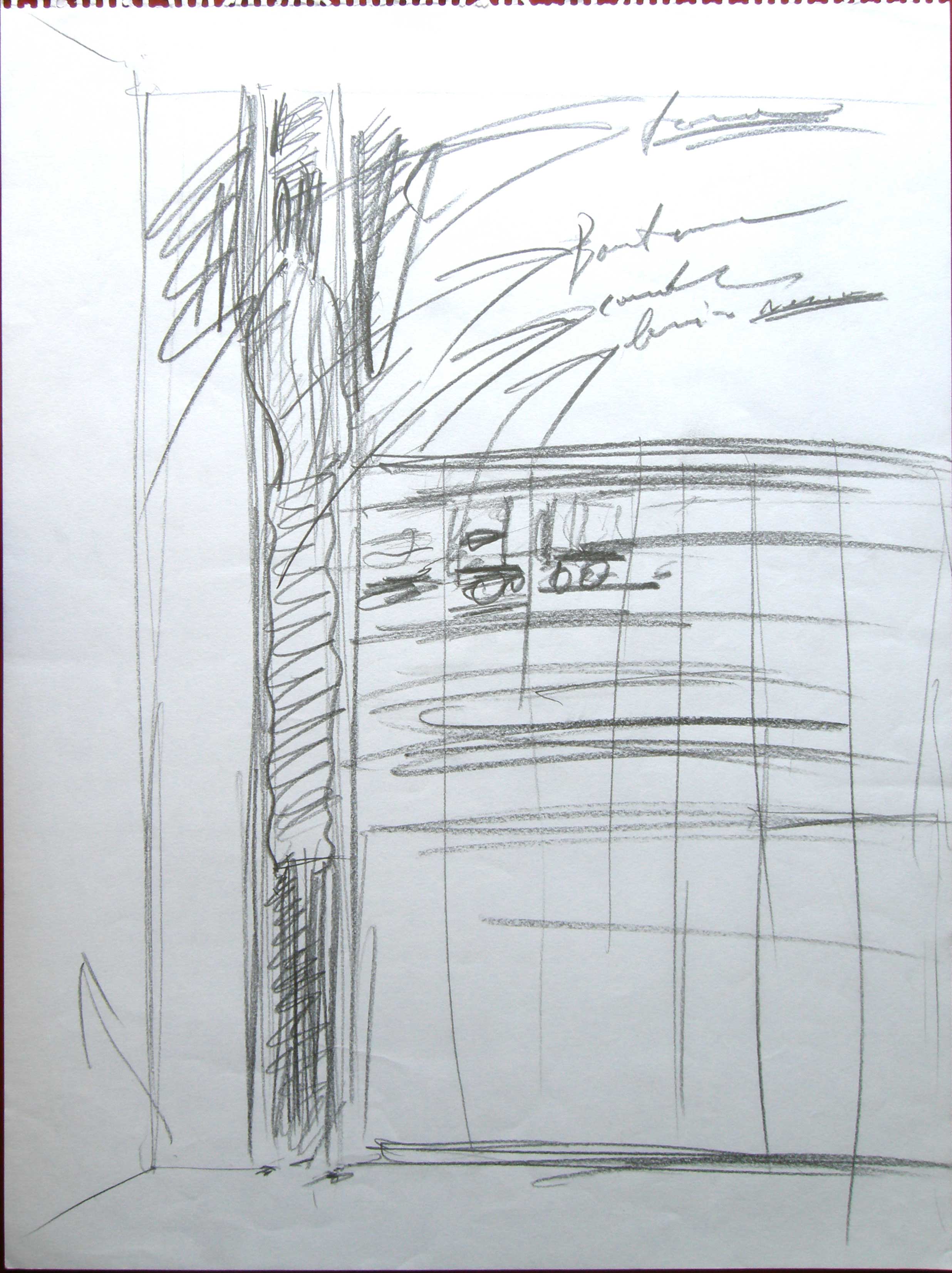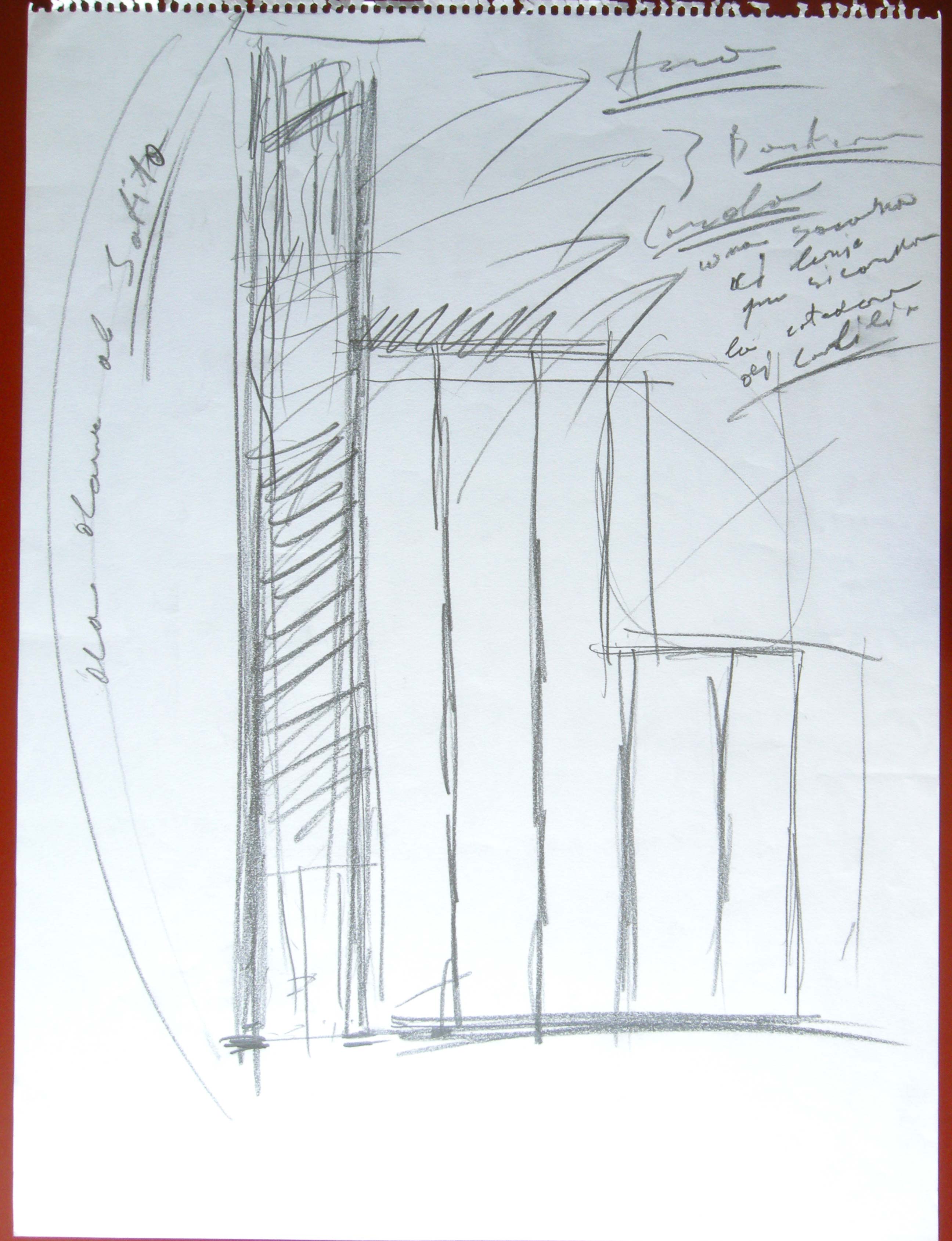 La fascinazione per la cattedra di Galileo è più che mai attiva nel bozzetto n. 1, che mostra una costruzione dove le tavole di legno sono disposte verticalmente, come quelle della cattedra. Questa è richiamata anche dalla progressione in altezza della struttura, da destra a sinistra, con il culmine simbolico della putrella contenente le bandiere italiane, con la differenza che Kounellis spezza in due livelli orizzontali l’obliqua che accompagnava il salire in cattedra. Il disegno presenta inoltre alcune annotazioni, di lettura risolvibile ma con qualche incertezza, anche perché non curate ortograficamente. A sinistra, l’indicazione «da alzare [?] al sofito» stabilisce l’altezza massima dell’opera, raggiunta appunto, nella prima concezione, solo dall’alloggiamento dei tricolori. È uno dei due cenni molto vaghi, espressi dai bozzetti, che considerano la relazione con lo spazio, fattore fondamentale per Kounellis e per l’installazione di Padova in particolare, ma che ancora non può precisarsi in quanto la collocazione sarà stabilita solo in seguito al secondo e decisivo sopralluogo, avvenuto a metà marzo 1995.