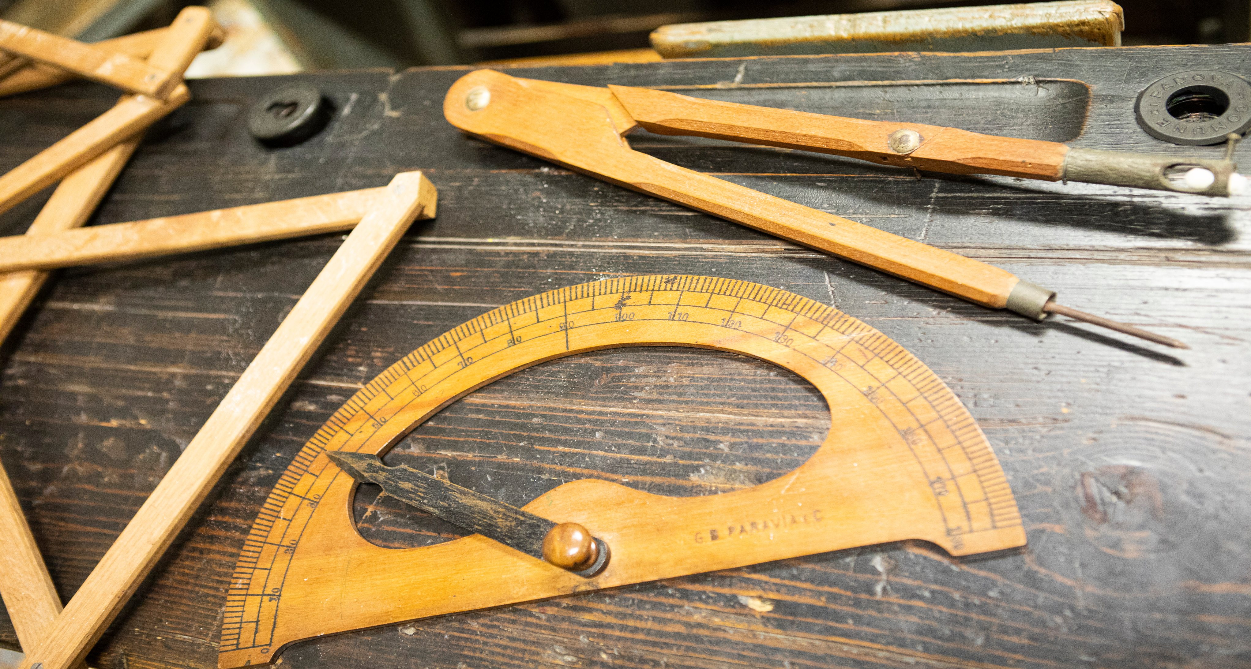 Compasso, goniometro e pantografi nell'allestimento del museo dell'educazione dell'università di Padova. Foto: Massimo Pistore