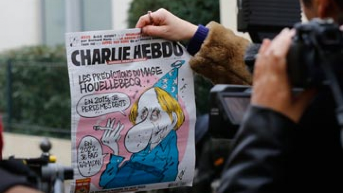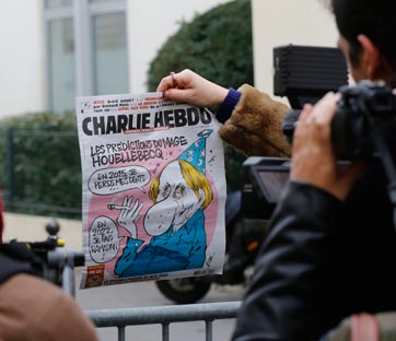 La prima pagina satirica di Charlie Hebdo con un caricatura dell'autore di Sottomissione, Michel Houellebecq. Foto: Reuters/Jacky Naegelen