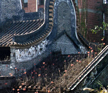Di quelli che furono quattro templi, o dimore degli avi - questo non sono in grado di comprenderlo - uno solo raccoglie ancora le volute dell'incenso. L'odore intenso fa dilatare le narici. Lo spazio è rischiarato solo da due piccoli lucernari ingialliti dalla patina del fumo, è un luogo buio e umido, capace di dare ristoro – la luce del sud della Cina è lattea ed è diffusa uniformemente dalla perenne foschia. Ogni suono, da quello dell'autostrada poco distante ai cantieri dei nuovi compound a quello degli animali e degli uomini, si ferma sulla soglia, non entra in questo edificio. Due templi, quelli vicini alla sommità della collina, sono del tutto abbandonati – i pannelli di legno decorato giacciono a terra, tra le felci e le piante dalle radici aeree; dove erano gli altari e le effigi del Buddha il volto di Mao si sta scolorendo, sono le memorie della Rivoluzione culturale che abbandonano questo Paese. La farmacia della medicina tradizionale cinese ora è invasa dai rampicanti, c'è ancora l'armadio dei farmaci e c'è paglia nei circa quaranta cassetti, i flaconi di vetro soffiato sono ancora disposti sui ripiani. La polvere copre tutto, sbiadisce. Brillanti, invece, sono i colori degli innumerevoli pezzi che i writer cinesi hanno lasciato in questi luoghi, questa è una hall of fame per la Street-art di Guangzhou, la megalopoli che gli europei chiamavano Canton e che non dista molto. Sulle pareti interne del tempio ci sono grandi murales rossi e argentati e qualche tag, non so quale writer abbia dipinto un volto rosso alto due metri accompagnato dalla didascalia “class action”.
