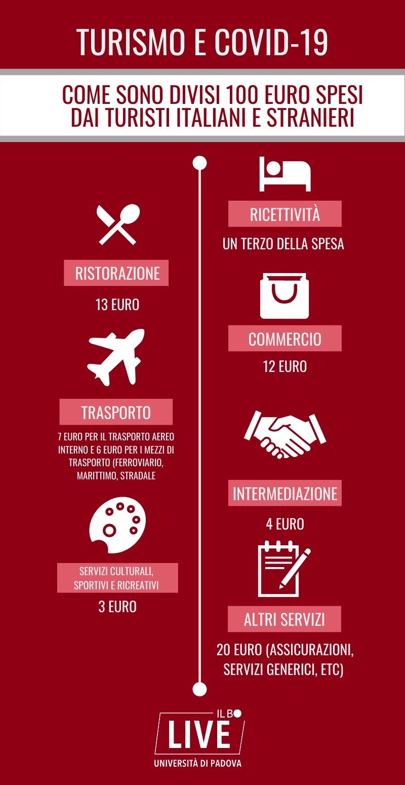 Considerando le premesse globali, anche il turismo italiano soffre di fronte a questa emergenza. In Italia nel 2018, secondo quanto riportato dal Touring Club Italiano, sono state registrate nelle strutture ricettive ufficiali (alberghiere ed extralberghiere) 429 milioni di presenze, con un’importante componente di stranieri che nella maggior parte dei casi appartengono a paesi europei. I flussi esteri, secondo la stima di chiusura del 2019, producono una spesa nel nostro paese di circa 45 miliardi, di cui il 54% si colloca nel Nord Italia. Poiché i servizi non sono immagazzinabili come altri beni, è difficile capire le conseguenze economiche del Covid-19. Il TCI spiega che il turismo è un settore trasversale, cioè coinvolge diversi ambiti economici come la ristorazione oppure i servizi culturali, ed è difficile quindi rilevare le perdite che si possono avere.