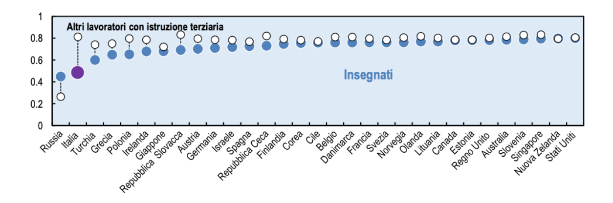 Secondo l’Ocse “mentre in molti Paesi gli insegnanti utilizzano le ITC con pari intensità rispetto ad altri lavoratori con istruzione terziaria, gli insegnanti Italiani rimangono indietro e utilizzano le nuove tecnologie ben al di sotto di altri lavoratori altamente qualificati”.