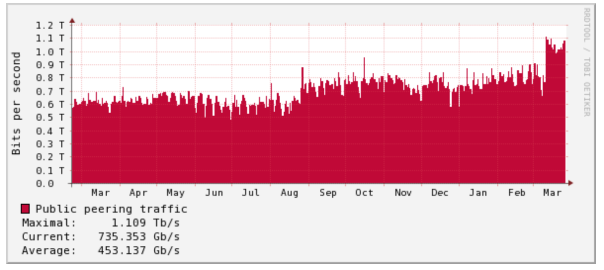 L’incremento di traffico nell’ultimo periodo è stato significativo e, come riporta un’analisi di Agenda Digitale, “da martedì 10 (giorno successivo al DPCM del 9 marzo ndr)i picchi sono saliti a 1000-1100 Gbps, con un aumento fino al 50%. Il traffico è salito in tutte le fasce orarie, con due periodi di punta, tipicamente tra le 16 e le 19 e tra le 21 e le 23” Una conferma di ciò che abbiamo visto precedentemente con un utilizzo dei servizi più pesanti per la rete, quindi streaming e videogames, nelle ore serali.