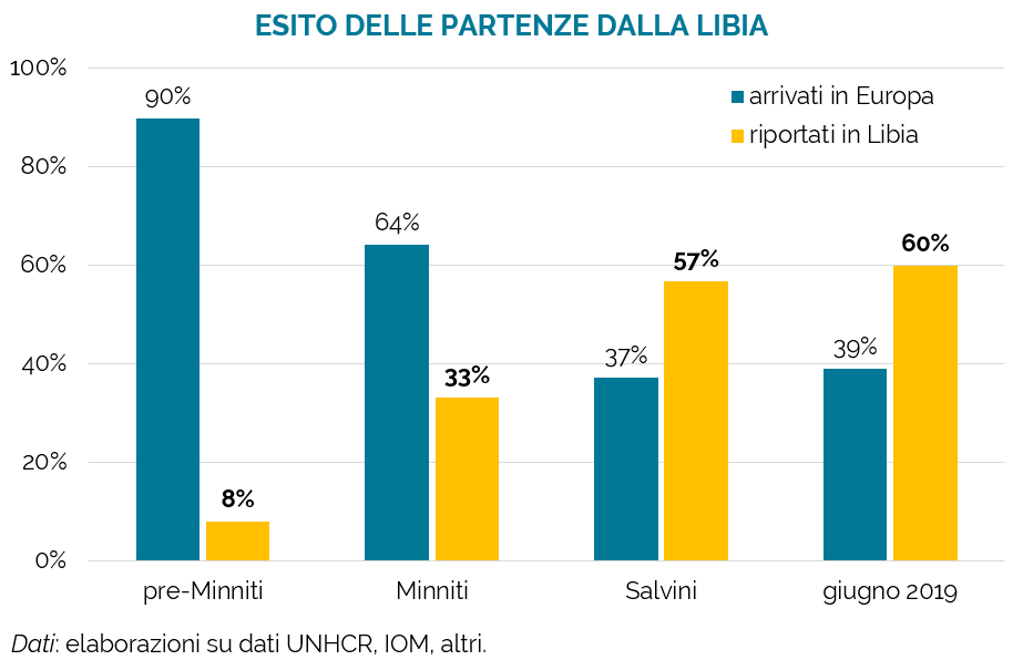 L’attività della Guardia costiera libica però sembra non essere stata sempre così accesa. Secondo un’analisi effettuata da Matteo Villa, ricercatore dell’ISPI, la percentuale di riportati in Libia è passata dall’8% del pre-Minniti, all’attuale 60%.