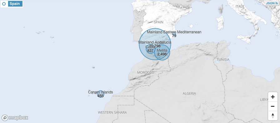 La rotta spagnola si conferma anche nel 2019 una di quelle più affollate. Quando parliamo di Spagna però dobbiamo ben tenere a mente la conformazione geografica. Molti migranti infatti entrano in territorio spagnolo attraverso le isole Canarie o tramite due enclavi spagnole in territorio marocchino: Melilla e Ceuta. In particolare a Melilla è arrivata la quasi totalità dei migranti giunti via terra (2.498 persone).