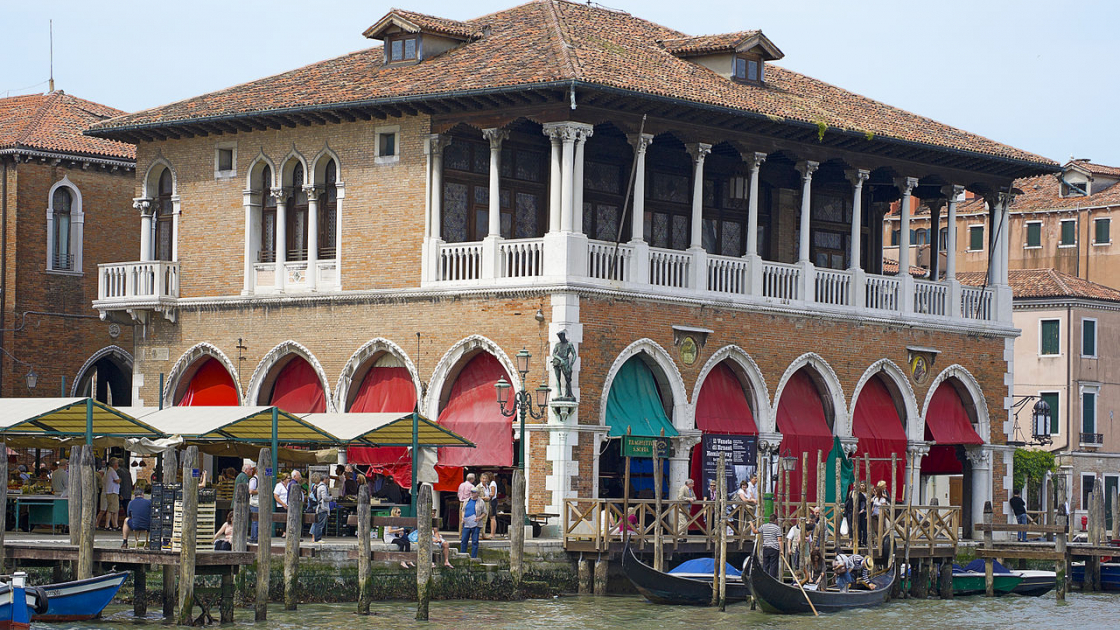 Sono 922 anni che a Rialto si fanno affari: un flusso ininterrotto di beni e alimenti che già sfilavano quando il ponte ancora non c’era. La tradizione pone la nascita del mercato al 1097, quando gli Orio, signori di Rialto, donano al patrimonio pubblico le loro proprietà. Oggi quest’area è uno dei simboli del progressivo dissolversi di Venezia come città, e della sua trasformazione in una riserva di caccia in cui le prede sono sia i turisti che i residenti. Il luogo più rappresentativo del mercato di Rialto è, senza dubbio, il Palazzo della Pescheria, l’edificio neogotico realizzato nel 1907 dall’architetto Domenico Rupolo e dal pittore Cesare Laurenti. E proprio la loggia del palazzo affacciata sul Canal Grande, insieme al retrostante stalon, è oggi la semivuota riprova della crisi delle attività commerciali di Rialto. Dove fioriva il mercato ittico, i banchi che un tempo valevano una fortuna si sono diradati a vista d’occhio. E la Pescheria trova nuovo fulgore solo in occasione di party in cui viene trasformata in discoteca.