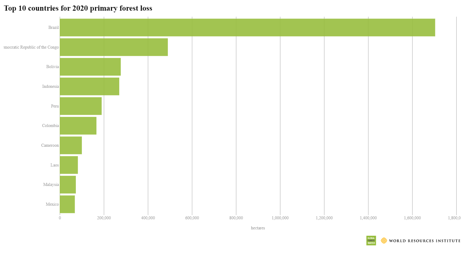 A minacciare in modo diretto il futuro delle foreste tropicali sono anche le attività di deforestazione. Secondo un rapporto del World Resources Institute, basato sui dati della rete Global Forest Watch, nel 2020 i tropici hanno perso 12,2 milioni di ettari di copertura arborea e, di questi, oltre 4 milioni di ettari ha riguardato le foreste primarie tropicali umide, particolarmente importanti per lo stoccaggio del carbonio e la biodiversità. Il paese più colpito continua ad essere il Brasile e il Congo figura al secondo posto.