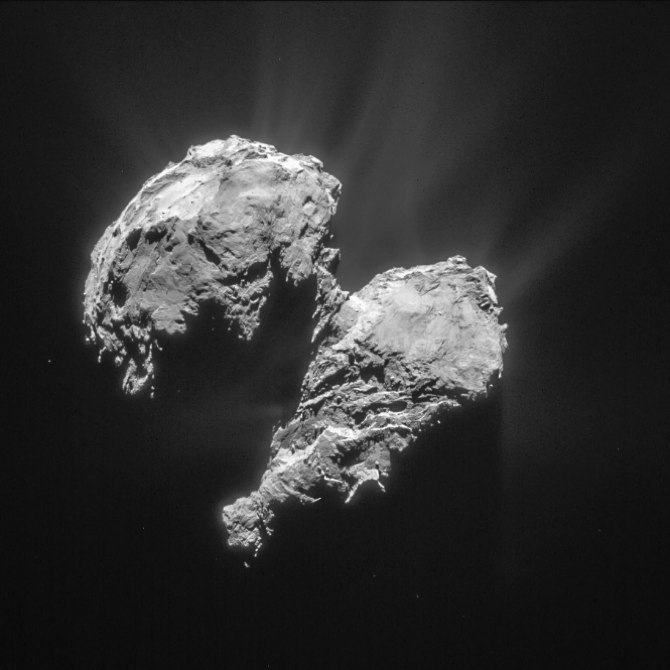 Il nucleo della cometa 67/P Churyumov-Gerasimenko visto dalla sonda Rosetta a 77,8 km di distanza. I raggi diffusi attorno al nucleo sono i getti di gas e polveri generati alla sublimazione dei ghiacci della cometa. (Crediti: ESA/Rosetta/NAVCAM – CC BY-SA