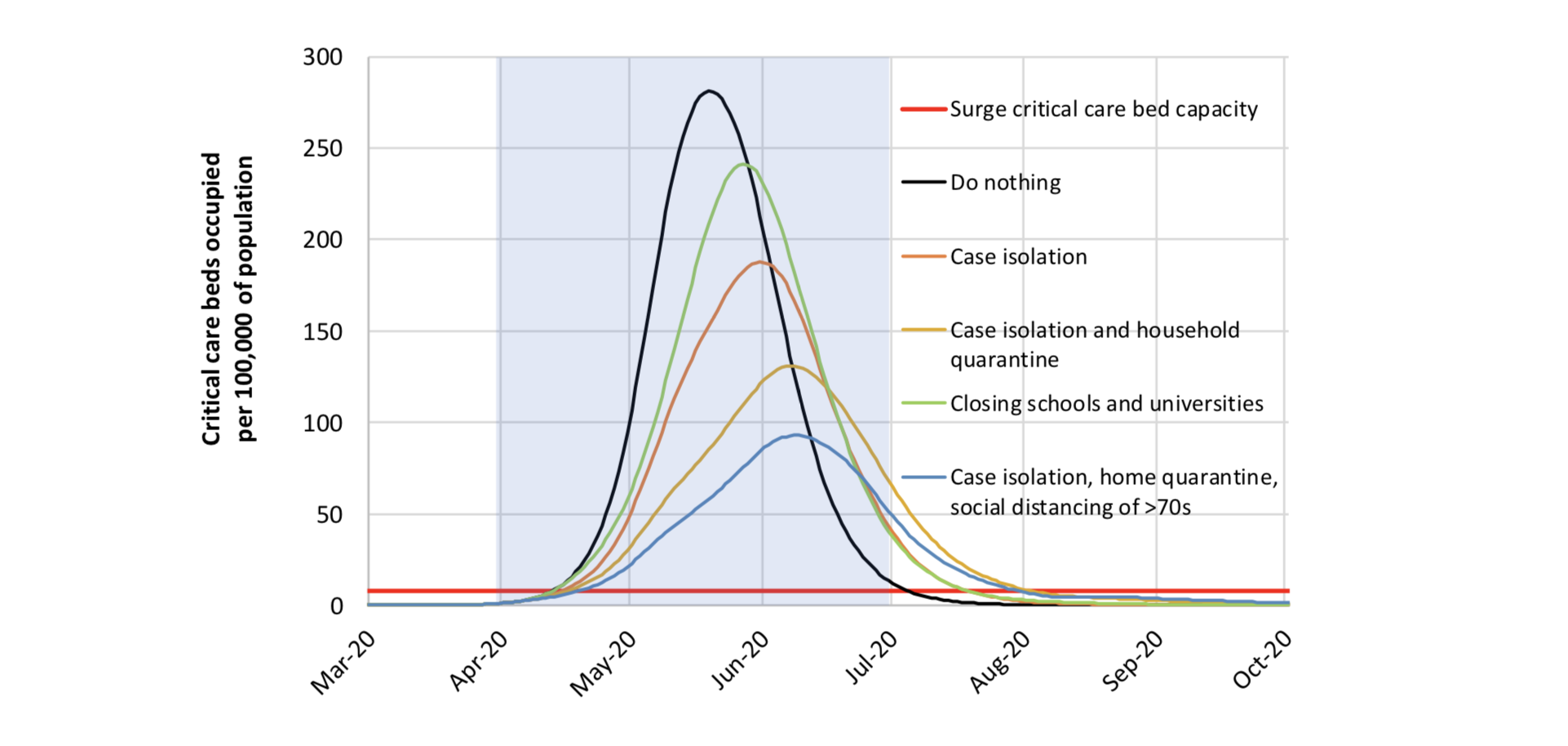 Il grafico mostra il numero di persone che potrebbero necessitare di un posto in terapia intensiva in UK a seconda delle diverse strategie di mitigazione