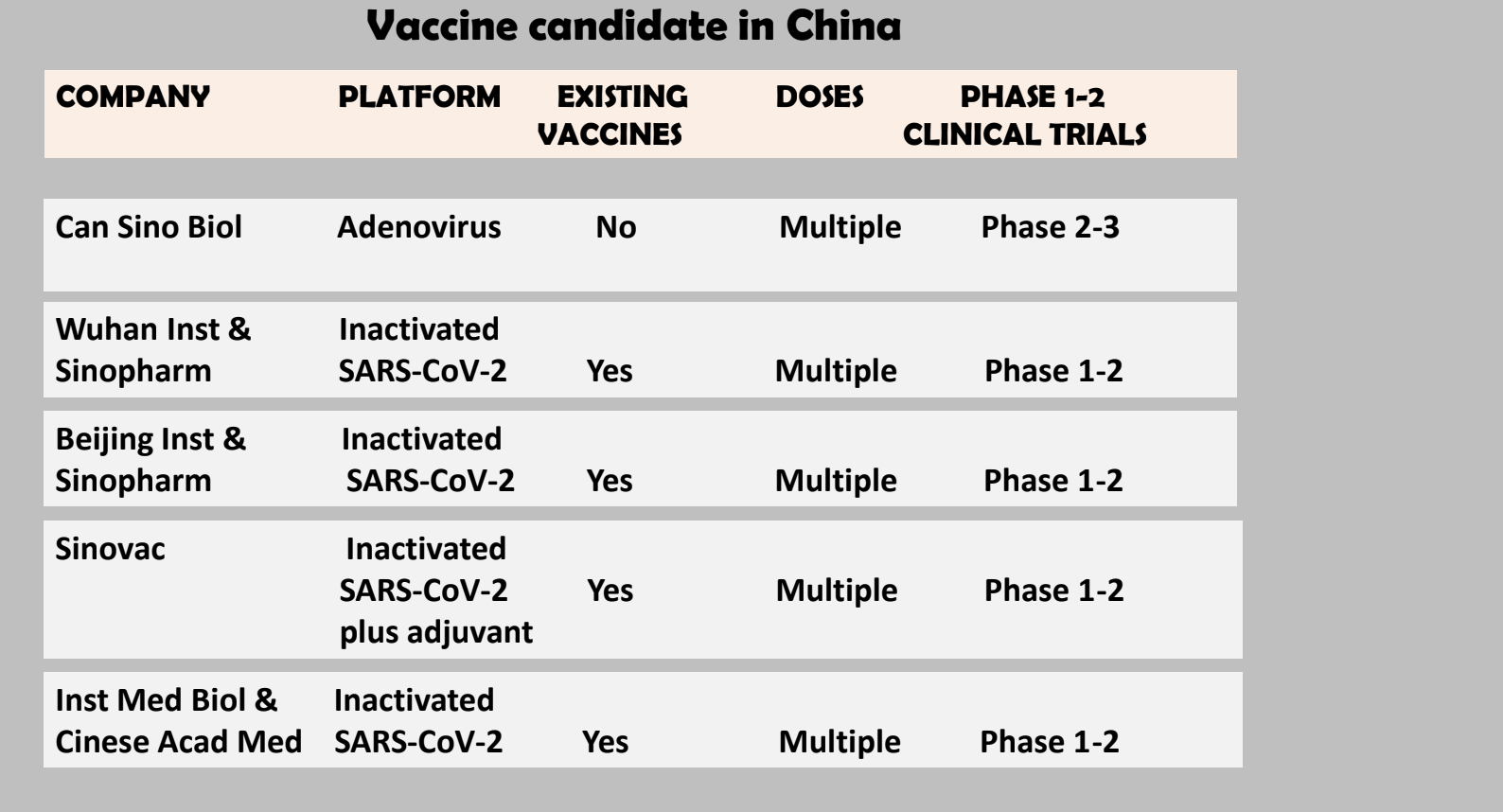 "Completamente diversa è la situazione cinese dove ci sono ormai cinque vaccini in fase avanzata di valutazione clinica e che verranno poi provati su volontari. In Cina è un po’ tutto più misterioso, quindi si hanno meno notizie su quali tipi di volontari vengono utilizzati e in quale maniera vengono testati. Però verranno diffusi i risultati ottenuti e, come dicevo all’inizio, i vaccini cinesi sono basati sostanzialmente su tecnologie vecchie, molto collaudate, quelle dei vaccini che abbiamo tradizionalmente ricevuto nella nostra vita, come quello della poliomelite. Molti di questi candidati vaccini cinesi in prova sono realizzati a partire dal virus ucciso. Uno solo è basato su un adenovirus simile a quello dell’AstraZeneca. Sul gruppo cinese si sa che vanno avanti velocissimi ma conosciamo meno dettagli su come si svolgeranno in futuro le ricerche, anche se abbiamo degli ottimi dati sui risultati che questi vaccini hanno ottenuto fino ad ora".