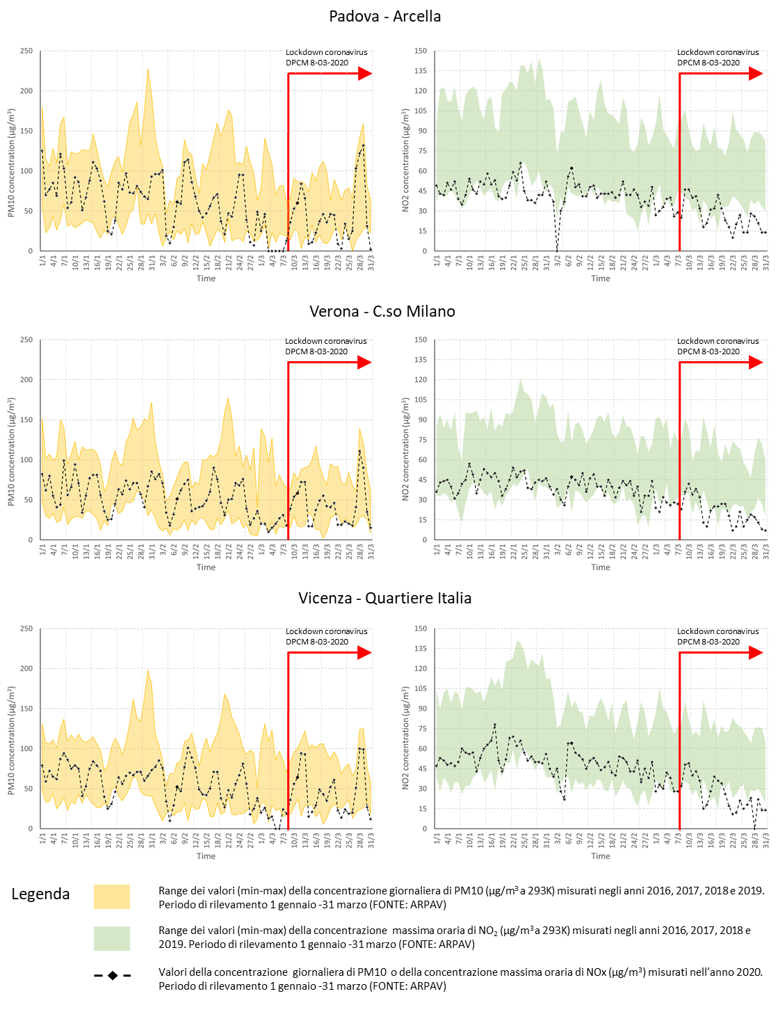 La comparazione nei tre siti investigati evidenzia una mancanza di correlazione tra concentrazione di PM10 e riduzione delle sorgenti emissive a seguito del lockdown imposto a partire dall’8 marzo. In alcuni giorni si sono addirittura registrati dei picchi di concentrazione. Come commentato da Arpav, con cui si condivide l’analisi, la causa più probabile è da ricercarsi non a livello locale ma in processi di ampia scala, ovvero l’arrivo di aria densa di polveri sottili di origine non antropica ma naturale (polveri desertiche) trasportate dalle correnti.