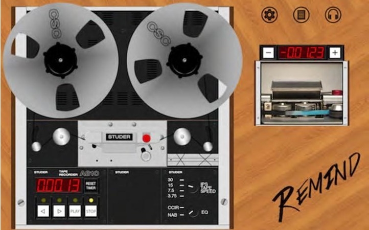 Applicazione Remind per tablet: simula le caratteristiche di un magnetofono analogico e mostra il video del nastro originale.
