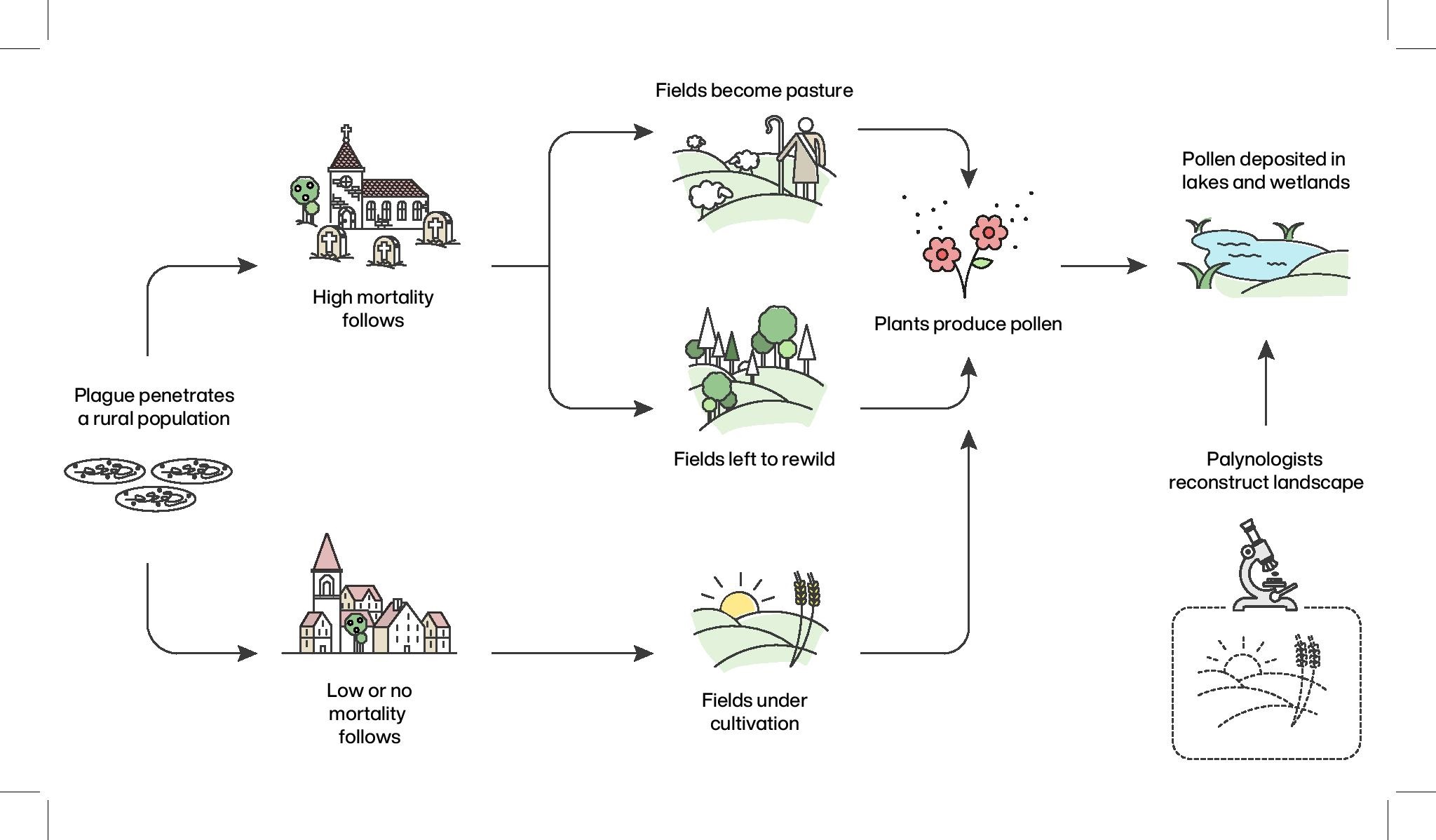 Lo studio delle fonti storiche suggerisce che la diffusione della peste sia stata massiccia e uguale in tutta Europa, ma questo è stato confermato solo dai campioni raccolti in alcune regioni come la Scandinavia, la Francia, l’Italia centrale e la Germania sud-occidentale, dove i dati pollinici riflettono un calo consistente della cerealicoltura. Ci sono poi alcune aree, come la Spagna, l’Irlanda e i paesi del centro Europa, in cui le attività agricole sono diminuite, ma non si sono arrestate completamente.