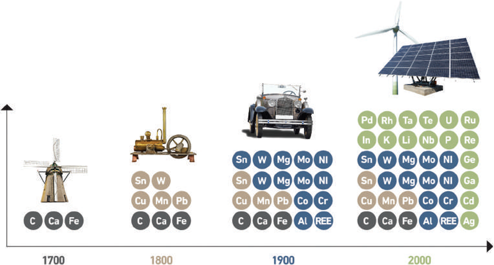 La transizione verso un’economia decarbonizzata, resa urgente dalla emergenza climatica in corso, pone una serie di problemi generalmente sconosciuti o sottovalutati. Come tutte le attività umane, in particolare considerando i megatrend del 21° secolo, quali l’aumento della popolazione (l’ONU prevede 9,8 miliardi per la metà secolo) e il fenomeno dell’inurbamento (sempre l’ONU prevede che nel 2050 il 70% della popolazione vivrà in arre urbane e vi saranno oltre 40 megacittà con più di 10 milioni di abitanti), anche la transizione energetica avrà il suo impatto sul pianeta. Considerando che globalmente circa l’85% dell’energia primaria deriva dai fossili, per raggiungere verso il 2050 il 45% di elettricità nell’offerta di energia, la produzione elettrica dovrà più che raddoppiare, un valore di cui la quota fotovoltaica ed eolica rappresenterà circa due terzi. Questo megatrend nella produzione e nel consumo di energia richiederà una vasta gamma ed elevate quantità di minerali da cui estrarre gli elementi indispensabili alle moderne applicazioni elettroniche, che si avvalgono dell’uso di una gran varietà di elementi chimici. La fabbricazione di un chip di computer richiede ben 44 elementi diversi. Un touch screen ha bisogno di un film sottile di ossido di indio; i capacitori usati in elettronica richiedono tantalio; i magneti permanenti di vario tipo, che vanno dai sottili altoparlanti dei telefoni cellulari agli enormi magneti delle turbine eoliche, necessitano di neodimio. Le batterie agli ioni di litio contengono anche cobalto e grafite.