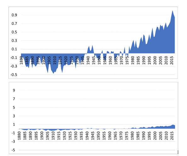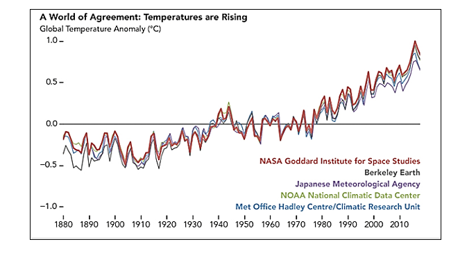 Recentemente, due autorità internazionali in fatto di clima hanno pubblicato dei dati molto contrastanti sul cambiamento climatico dal 1880 ad oggi. L’Agenzia Internazionale di Controllo e Tutela Ambientale ha riportato un drastico innalzamento della temperatura a partire dagli anni Ottanta, che tocca il suo picco verso il 2016 (Figura 1).