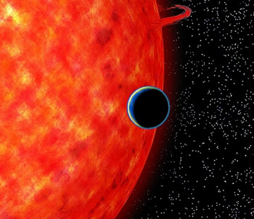 Visione artistica del pianeta GJ3470b che passa di fronte al disco della stella ospite