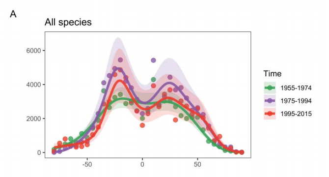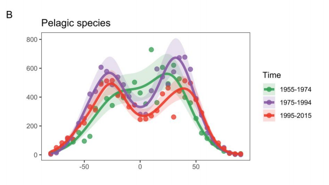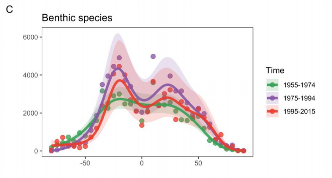 Prendendo in considerazione per un attimo solamente le specie pelagiche, lo studio mette in luce come la loro distribuzione, dal 1955 al 1974, fosse più preponderante nell'emisfero settentrionale. Dal 1975 in poi però i modelli sono cambiati notevolmente ed hanno evidenziato come la ricchezza, per le specie pelagiche, diminuiva all'equatore ed era relativamente più alta nelle regioni subtropicali. Per le specie bentoniche invece si è evidenziato un accenno di declino della ricchezza all'equatore dal 1975, ma un chiaro aumento nelle regioni subtropicali.