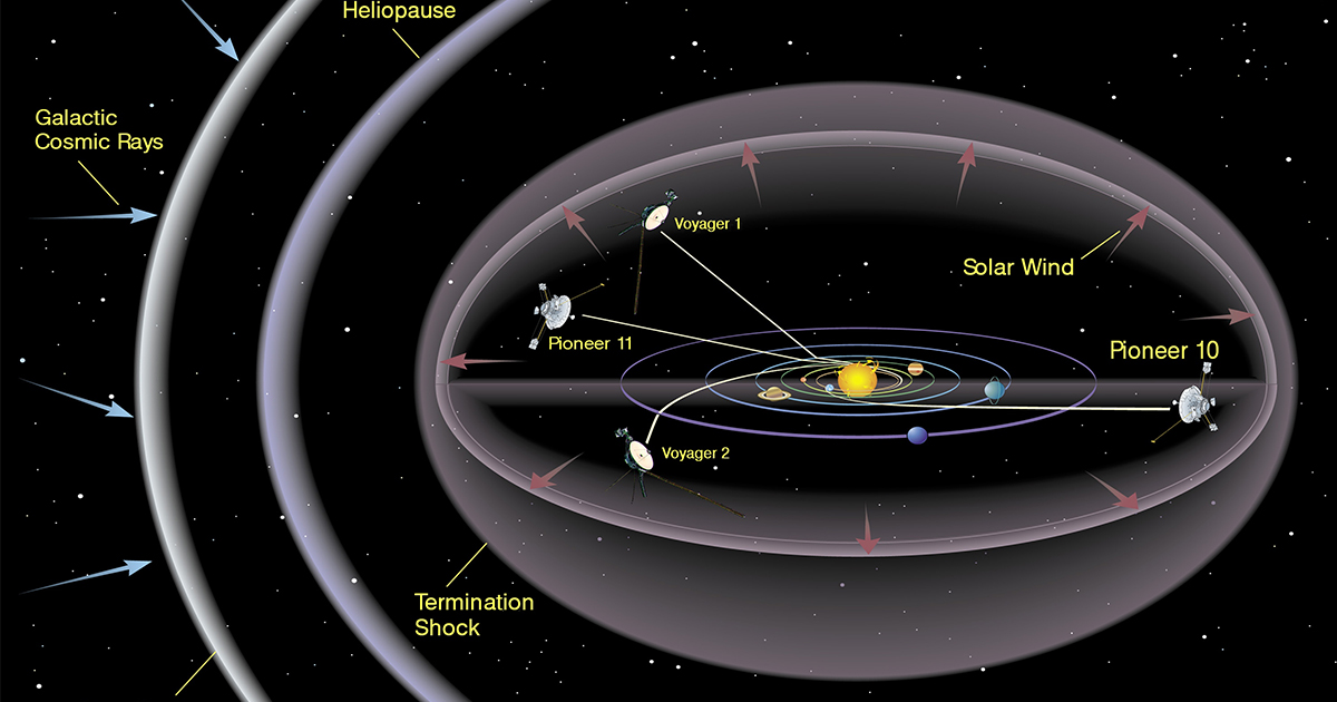 Struttura dell’Eliosfera con la traiettoria delle sonde Pioneer e Voyager che escono dal Sistema Solare. Foto: Nasa