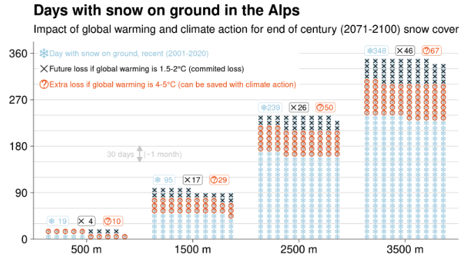 Se le serie storiche ci fanno capire come il periodo che stiamo vivendo sia già di grande cambiamento climatico, ancora più sconcertanti sono le proiezioni, anche quando si parla di neve. Secondo l'European Geosciences Union infatti l’impatto della crisi climatica sarà evidente anche per quanto riguarda la neve a terra. Basandosi sulla media dei giorni con neve tra il 2001 e il 2020, vediamo che le proiezioni sono chiare sia in caso di innalzamento della temperatura tra il grado e mezzo ed i due, sia in caso questo sia di 4 gradi. Nel primo caso, considerando gli attuali 95 giorni di presenza della neve a terra, vediamo che la perdita sarebbe di 17 giorni. In una condizione di aumento di temperatura tra il grado e mezzo e due rispetto all’era pre industriale quindi dovremmo abituarci ad avere tre settimane di neve a terra in meno.