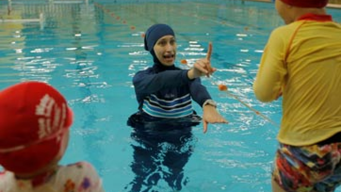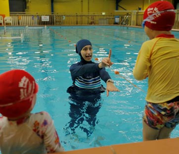 Un'istruttrice di nuoto in piscina con il burkini mentre fa lezione ai suoi figli. Foto: Reuters/Jason Reed