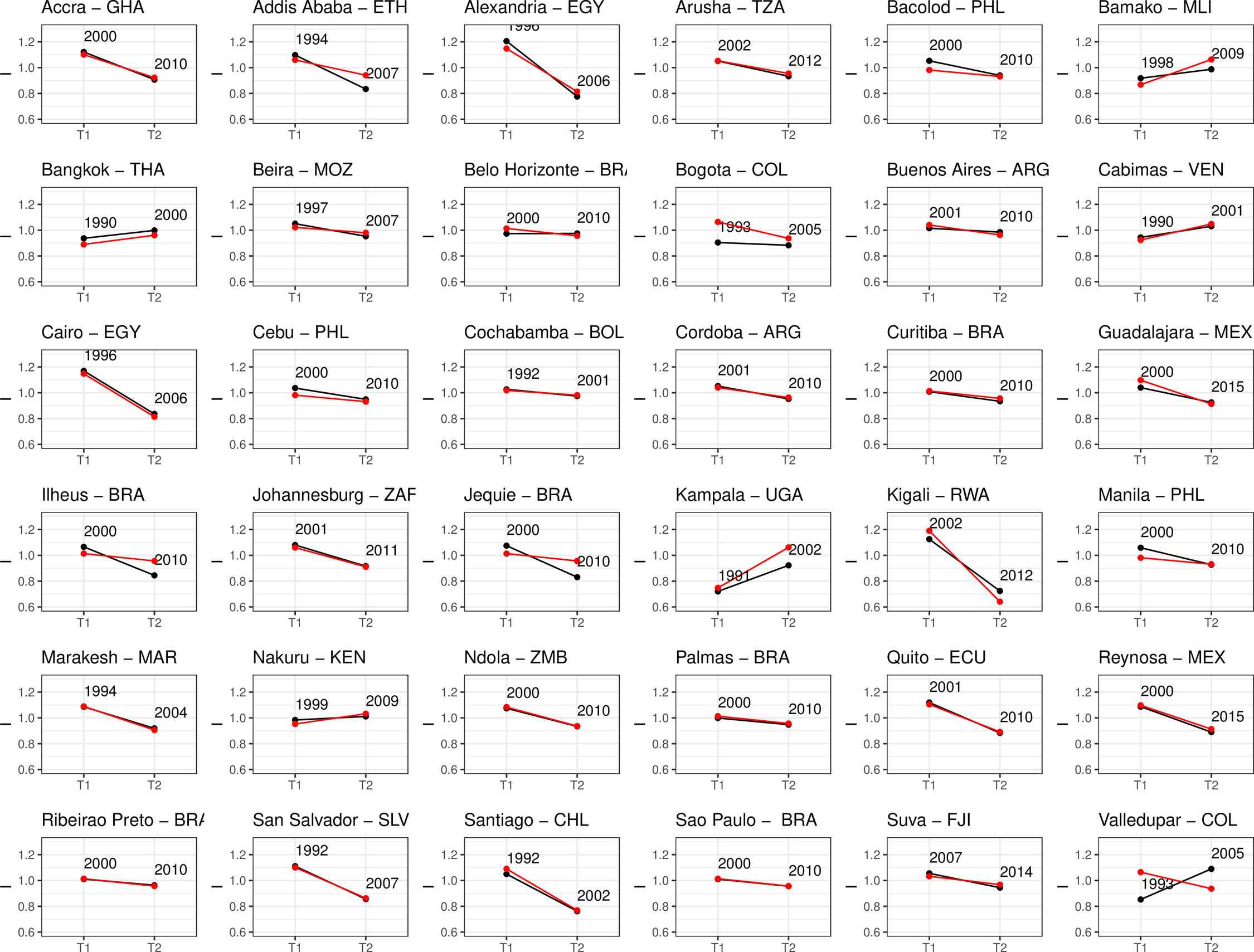 Fino ad ora abbiamo spiegato il funzionamento del database DUIA, ma vediamo quali sono i risultati. Un’opportunità del DUIA è proprio quella di poter studiare le disuguaglianze all'interno e tra le città. Facendo un esempio concreto di come funziona questo database con relativi script, vediamo come sia stata analizzata l’evoluzione della disuguaglianza di 36 diverse città rispetto anche al loro Paese.
