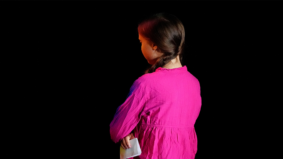 Greta Thunberg di spalle poco prima del suo intervento al climate summit dell'Onu. Foto: Reuters