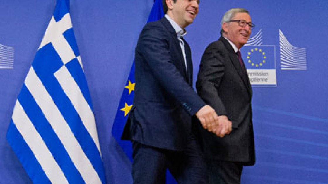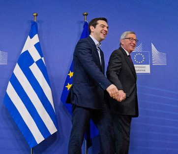 Bruxelles, febbraio 2015. L'incontro tra il presidente della Commissione europea Jean-Claude Juncker e il premier greco Alexis Tsipras. Foto: Reuters/Yves Herman