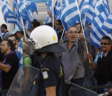 La polizia controlla i manifestanti del partito Alba Dorata in protesta contro l'arresto del loro leader. Foto: Reuters/John Kolesidis