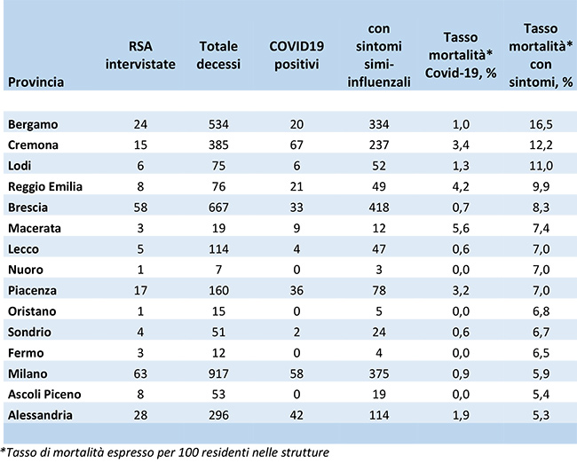 Se si considerano solamente le persone positive, un dato che abbiamo visto come sia piuttosto parziale, vediamo però che il tasso di mortalità tra i residenti nelle Rsa è stato dello 0,7 per cento, mentre se consideriamo anche chi aveva dei sintomi riconducibili al Covid-19 il tasso cresce al 3,1%. Sempre in Lombardia poi, ed in particolare nella provincia di Bergamo, si arriva ad un tasso di mortalità che supera il 16%.