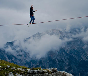 Nei boschi, e nelle pinete in riva al mare, hanno fatto la loro apparizione da un paio di estati (oltre a mirabolanti parchi avventura per veri baroni rampanti e manager che devono trovare la motivazione) le slackline, fettucce piatte di nylon o poliestere tese da un tronco d'albero all'altro ad altezze non vertiginose (oppure si, ma allora si chiamano highline); ci si cammina sopra per lunghi percorsi (longline), ci si contorce su con evoluzioni freestyle (alla maniera di quelle che si compiono con lo skateboard o lo snowboard). Possono diventare il passaggio precario sopra specchi d'acqua e giocoforza, sfociare nel tuffo e nel nuoto. La fettuccia in questione è mutuata dall'attrezzatura dell'arrampicata e di questa disciplina sportiva richiama l'universo di valori sotteso, è il caso di dirlo: sfida solitaria, confronto uomo natura, ricerca di emozione estrema, uniti alla rappresentazione, a beneficio proprio e altrui, del più profondo se' creativo.