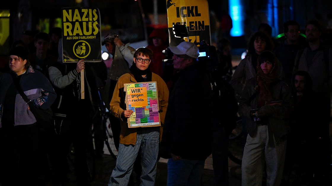 Proteste con cartelli "nazi raus" dopo la vittoria dell'FPO alle ultime elezioni politiche austriache. Foto: Reuters