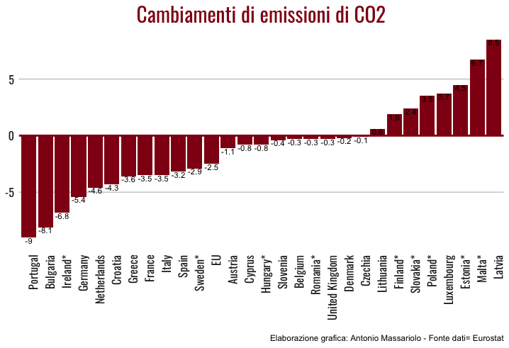 Per quanto riguarda l’Italia invece, che rappresenta il 10% del totale dell’Unione Europea delle emissioni di CO2, in un solo anno è riuscita a ridurle del 3,5%.