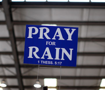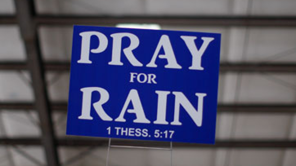 "Prega per l'acqua", così recita un cartello appeso durante una fiera agricola in California. Foto: Reuters/David McNew