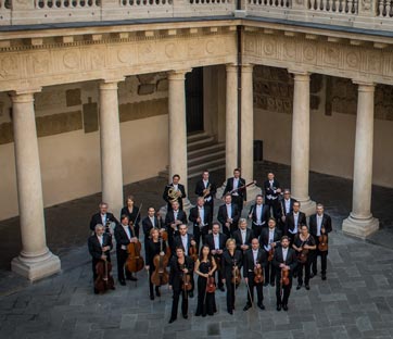 L'Orchestra di Padova e del Veneto in una foto di gruppo nel Cortile antico di palazzo Bo