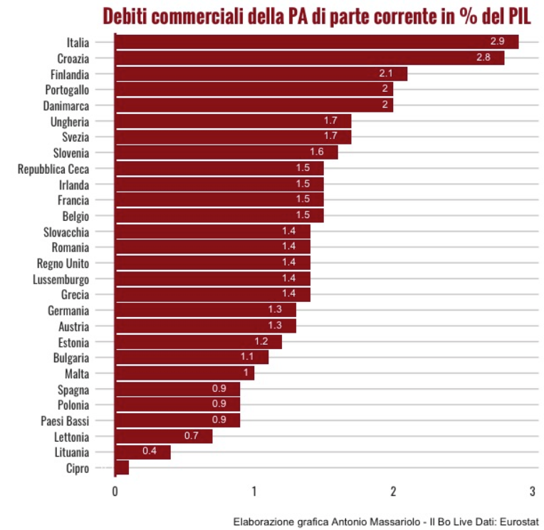 Ciò che però non è incerto è quello che esce dai dati Eurostat. L’Italia è il Paese con più debiti commerciali in relazione al proprio prodotto interno lordo. Nonostante il miglioramento, dovuto anche all’introduzione della fatturazione elettronica obbligatoria, l’Italia rimane uno stato in cui la pubblica amministrazione è fortemente indebitata con le aziende.