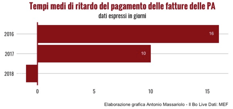 In Italia l'articolo 33 del d. lgs. n. 33/2013 obbliga tutte le pubbliche amministrazioni a pubblicare indicatori di tempestività, annuali e trimestrali, dei pagamenti relativi agli acquisti di beni, servizi e forniture. Analizzando i dati rilasciati dal MEF (Ministero dell’Economia e delle Finanze) vediamo come, anche in questo caso, ci sia stato un miglioramento rispetto ai tempi medi di ritardo relativi alle fatture del 2017 (10 giorni) e del 2016 (16 giorni).
