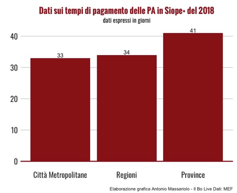 Andando più nel dettaglio ed affidandoci ai dati che escono da Siope+, cioè la piattaforma che è gradualmente divenuta obbligatoria per le PA dal 2017, in cui dovrebbero (il condizionale è d’obbligo e poi spiegheremo il motivo) essere caricate tutte le informazioni relative ai pagamenti, notiamo come le più “lente” a pagare siano le province con 41 giorni, seguite dai comuni e dalle città metropolitane che in media, rispettivamente, ci impiegano 34 e 33 giorni per pagare.