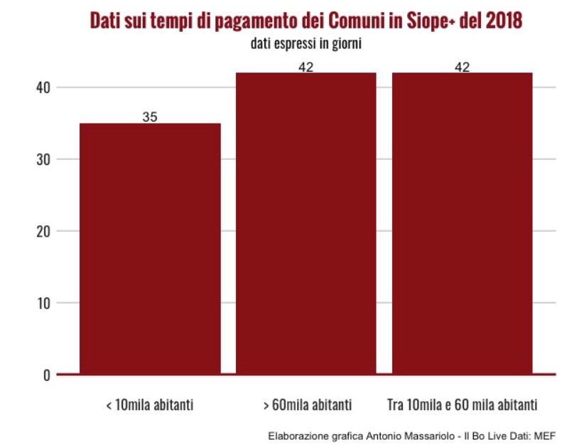 Un po’ meglio va ai comuni più piccoli. Quelli sotto ai 10mila abitanti mediamente pagano in 35 giorni, cioè con un solo giorno di ritardo sui limiti di legge. Come già accennato questo dato esce dal sistema Siope+, un sistema che però per ora ci permette di valutare solamente dal 1 aprile al 31 dicembre 2018 per i comuni più grandi, al 1 luglio al 31 dicembre per i comuni intermendi e dal 1 ottobre al 31 dicembre per i comuni più piccoli.