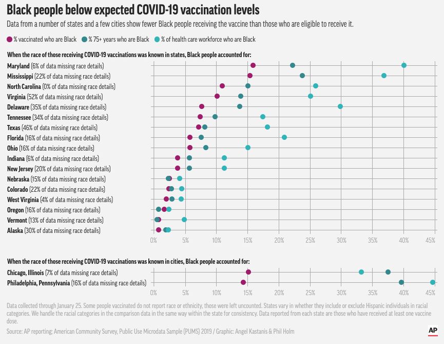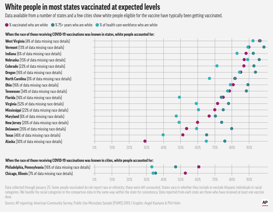 Come si nota dal grafico realizzato da AP, tutti i dati di cui abbiamo parlato riguardo alle vaccinazioni provenivano da: Alaska, Colorado, Delaware, Florida, Indiana, Maryland, Mississippi, Nebraska, New Jersey, North Carolina, Ohio, Oregon, Tennessee, Texas, Vermont, Virginia e West Virginia, oltre a due città, Philadelphia e Chicago.